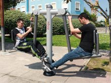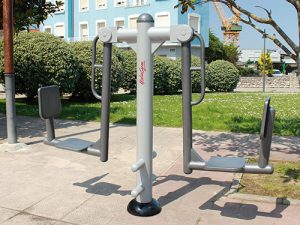 Destiné à une grande variété d’âges. Les mécanismes de ses éléments aident à minimiser l’effort physique, tout en optimisant le rendement. Les éléments formant le circuit aérobic sont fabriqués avec une colonne en acier d’un diamètre de 140 mm et d’une épaisseur de 3,5 mm comme élément de support. Le reste du matériel utilisé dans les composants présente des caractéristiques similaires en termes de robustesse et d’épaisseur. Le revêtement des pièces est réalisé avec de la peinture en poudre formulée avec des résines époxy et de polyester, sans TGIC. Elle s’applique au cours de la chaîne automatisée de peinture comprenant deux étapes de nettoyage, le séchage, l’application de la poudre et le thermodurcissement à 210º, assurant une résistance à la corrosion supérieure à 240 heures lors des tests en chambre de brouillard salin. Au cours de ce procédé, il est réalisé une double couche de peinture comprenant une première imprégnation de résine époxy riche en zinc et une couche externe de polyester de haute qualité. Le procédé permet d’obtenir une couche de peinture uniforme de protection, jamais inférieure à une moyenne comprise entre 100 et 130 microns. Le choix rigoureux des matières premières et la qualité du processus de production nous permet de donner un garantie d’un an. Des pièces de rechange sont disponibles et le service après-vente est garanti pour toute la durée de vie des éléments.