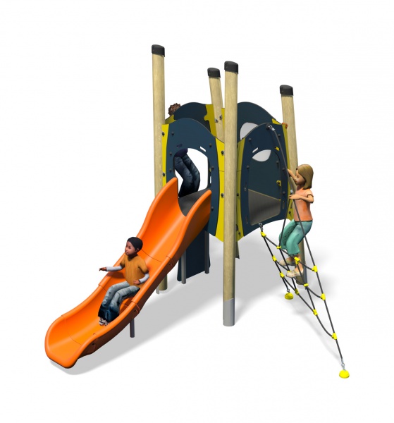 - Éléments de Jeu : La structure est équipée d’un toboggan, d’un panneau de grimpe et d’un filet en corde, offrant une variété d’activités pour stimuler l’imagination et les capacités motrices des enfants.