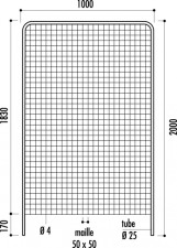 Cadre en tube Ø 25 mm, grille Ø 4 mm avec mailles 50 x 50 mm.