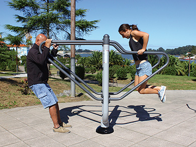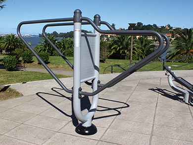Destiné à une grande variété d’âges. Les mécanismes de ses éléments aident à minimiser l’effort physique, tout en optimisant le rendement. Les éléments formant le circuit aérobic sont fabriqués avec une colonne en acier d’un diamètre de 140 mm et d’une épaisseur de 3,5 mm comme élément de support. Le reste du matériel utilisé dans les composants présente des caractéristiques similaires en termes de robustesse et d’épaisseur. Le revêtement des pièces est réalisé avec de la peinture en poudre formulée avec des résines époxy et de polyester, sans TGIC. Elle s’applique au cours de la chaîne automatisée de peinture comprenant deux étapes de nettoyage, le séchage, l’application de la poudre et le thermodurcissement à 210º, assurant une résistance à la corrosion supérieure à 240 heures lors des tests en chambre de brouillard salin. Au cours de ce procédé, il est réalisé une double couche de peinture comprenant une première imprégnation de résine époxy riche en zinc et une couche externe de polyester de haute qualité. Le procédé permet d’obtenir une couche de peinture uniforme de protection, jamais inférieure à une moyenne comprise entre 100 et 130 microns. Le choix rigoureux des matières premières et la qualité du processus de production nous permet de donner un garantie d’un an. Des pièces de rechange sont disponibles et le service après-vente est garanti pour toute la durée de vie des éléments.