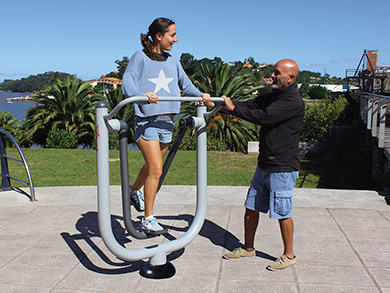 Destiné à une grande variété d’âges. Les mécanismes de ses éléments aident à minimiser l’effort physique, tout en optimisant le rendement. Les éléments formant le circuit aérobic sont fabriqués avec une colonne en acier d’un diamètre de 140 mm et d’une épaisseur de 3,5 mm comme élément de support. Le reste du matériel utilisé dans les composants présente des caractéristiques similaires en termes de robustesse et d’épaisseur. Le revêtement des pièces est réalisé avec de la peinture en poudre formulée avec des résines époxy et de polyester, sans TGIC. Elle s’applique au cours de la chaîne automatisée de peinture comprenant deux étapes de nettoyage, le séchage, l’application de la poudre et le thermodurcissement à 210º, assurant une résistance à la corrosion supérieure à 240 heures lors des tests en chambre de brouillard salin. Au cours de ce procédé, il est réalisé une double couche de peinture comprenant une première imprégnation de résine époxy riche en zinc et une couche externe de polyester de haute qualité. Le procédé permet d’obtenir une couche de peinture uniforme de protection, jamais inférieure à une moyenne comprise entre 100 et 130 microns. Le choix rigoureux des matières premières et la qualité du processus de production nous permet de donner un garantie d’un an. Des pièces de rechange sont disponibles et le service après-vente est garanti pour toute la durée de vie des éléments.