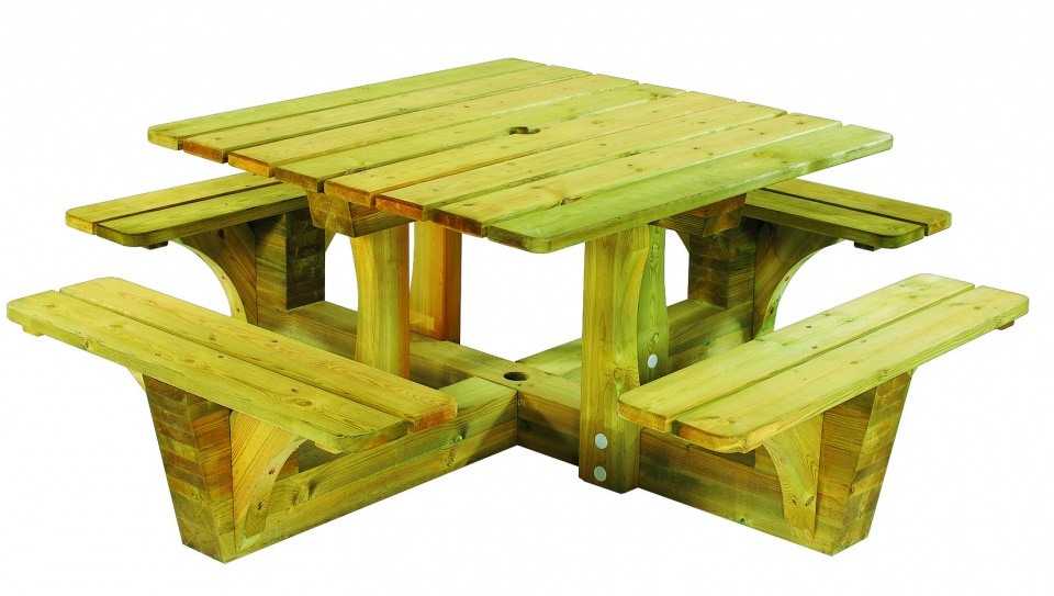 • Piètements du plateau en lamellé-collé de 140 x 140 mm, ép. 4,5 cm, les 4 pieds support plateau section 145 x 68 mm