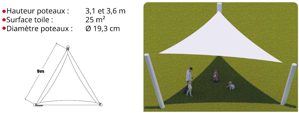 - Création de zones ombragées dans les cours d’école, aires de jeux, espaces de détente en camping ou places publiques.